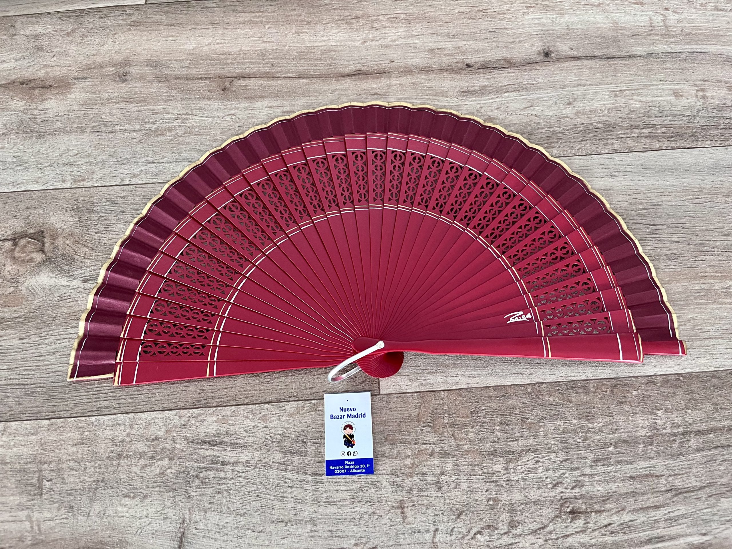 Abanico color vino, madera de abedul, con detalle calado en formas circulares.