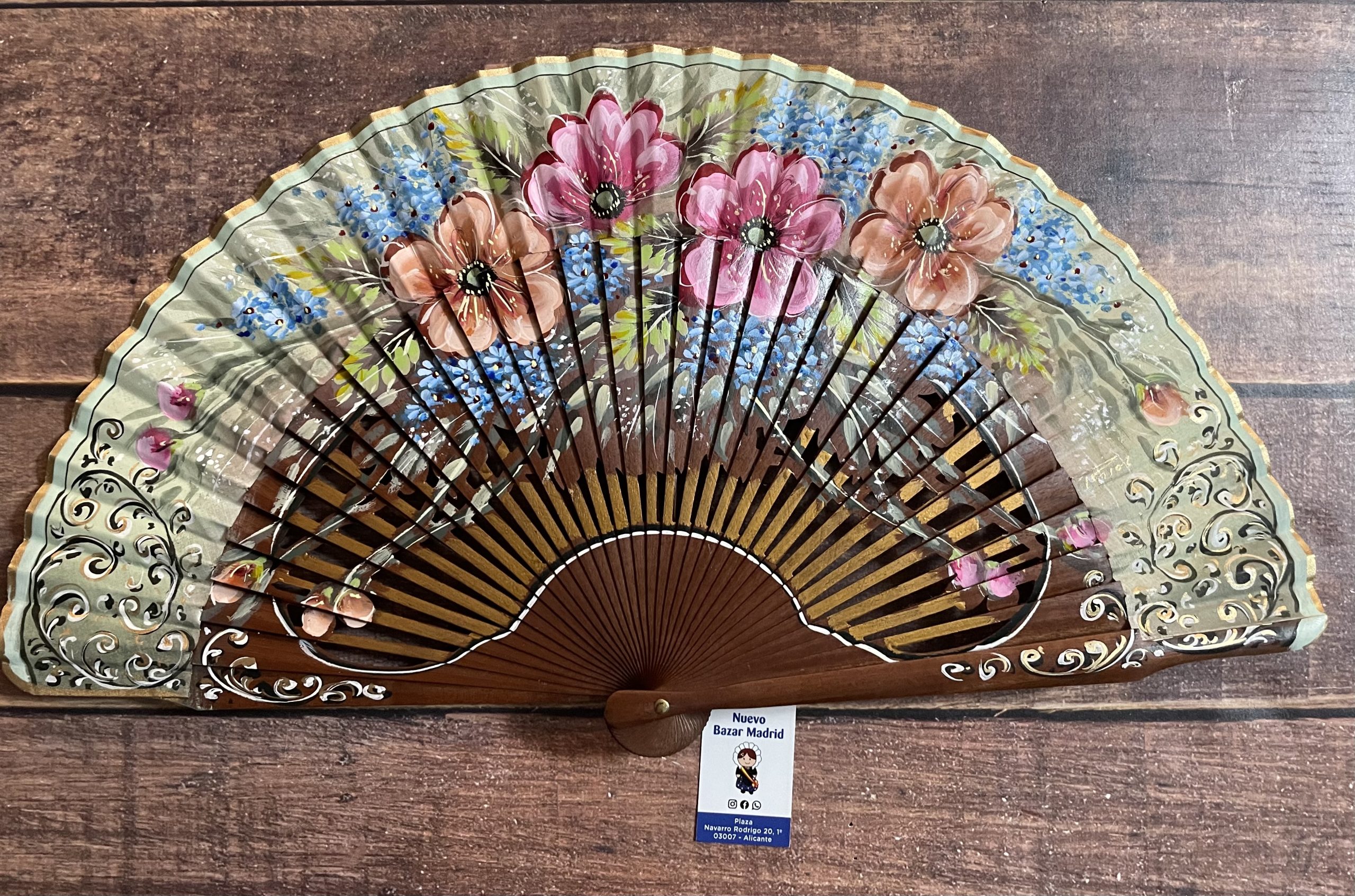 Abanico de madera de kotibe, país de algodón, pintado a mano con motivos florales, por artesanos abaniqueros, en la varilla del abanico podemos encontrar la marca de garantía del abanico: AEA(abanico español artesano). Se entrega en caja de cartón