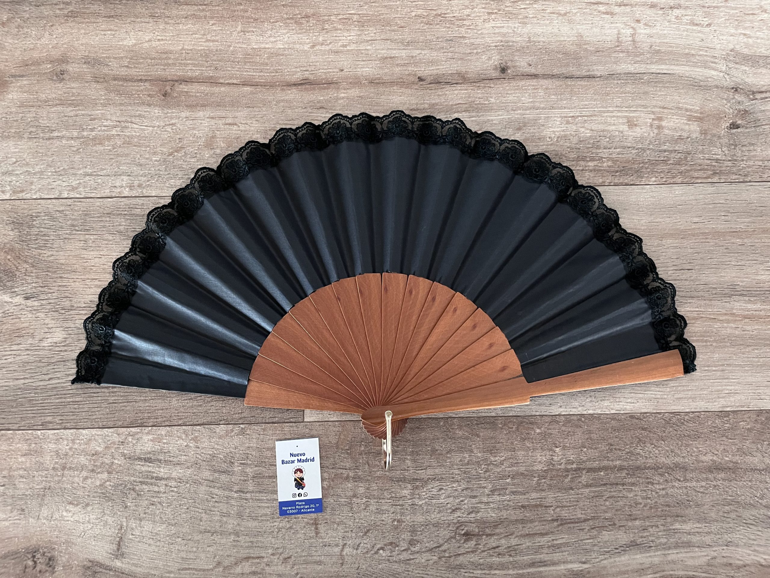 Abanico madera dante, color negro con encaje, país en algodón, encaje de blonda. Se entrega con estuche de cartón.