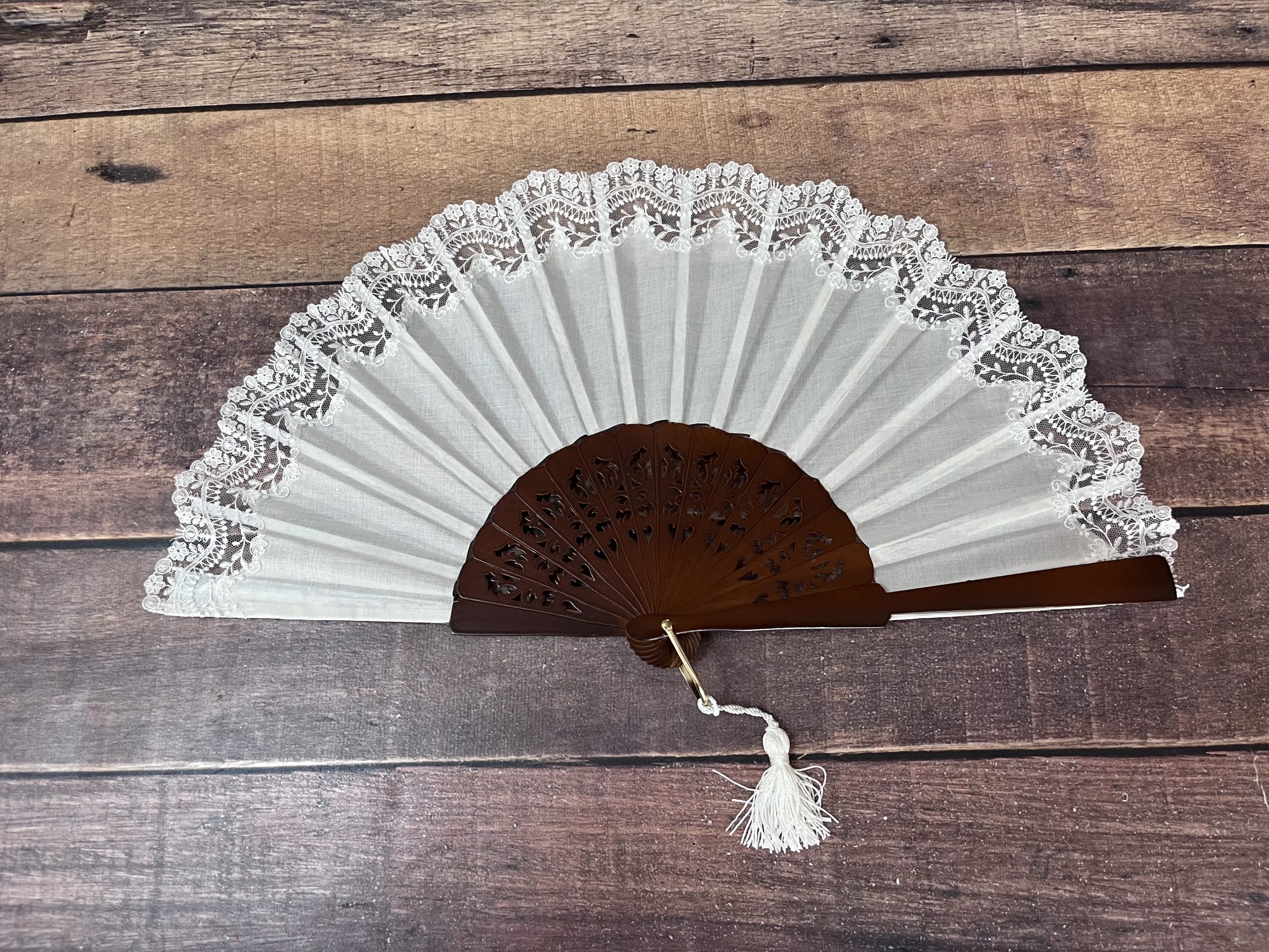 El abanico Loli combina varillas de madera calada con tela marfil y delicado borde de encaje, logrando un diseño clásico y sofisticado. Perfecto para bodas, celebraciones ,trajes regionales o como complemento de invitada, aporta distinción en cada gesto. 🤍