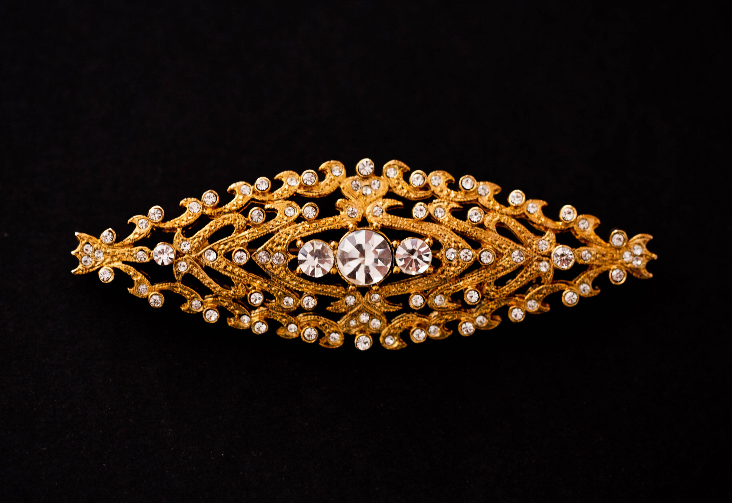 Broche de mantilla modelo Carla, es un broche bañado en dorado, con cristales de alta calidad, es ideal para llevar con mantilla, para recoger la cola de una novia y como adorno para invitada.